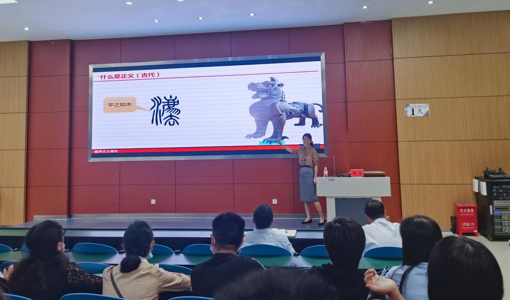 培训会上,黄莺老师进行了中文及全英文教学示范——《程序正义》《Witness Testimony》。培训中,黄老师结合自己的教学经历,从选题、设计、PPT和教案、课堂表现力、英文课堂教学比赛5个方面进行了分享示范,给大家带来一场集整体性、趣味性、思想性为一体的多元化视听盛宴。黄老师良好的专业素养、丰富的教学内容、扎实的理论功底及富有个人魅力的培训让参训教师受益匪浅,对提升教学能力,强化教师教学素养起到了良好的促进作用。